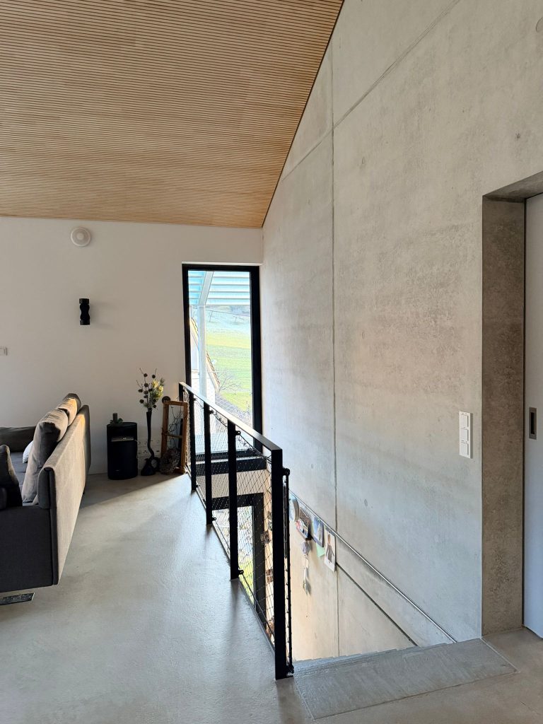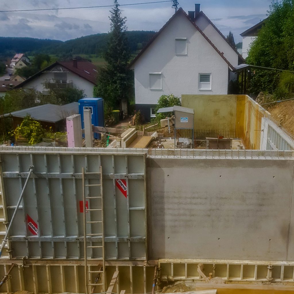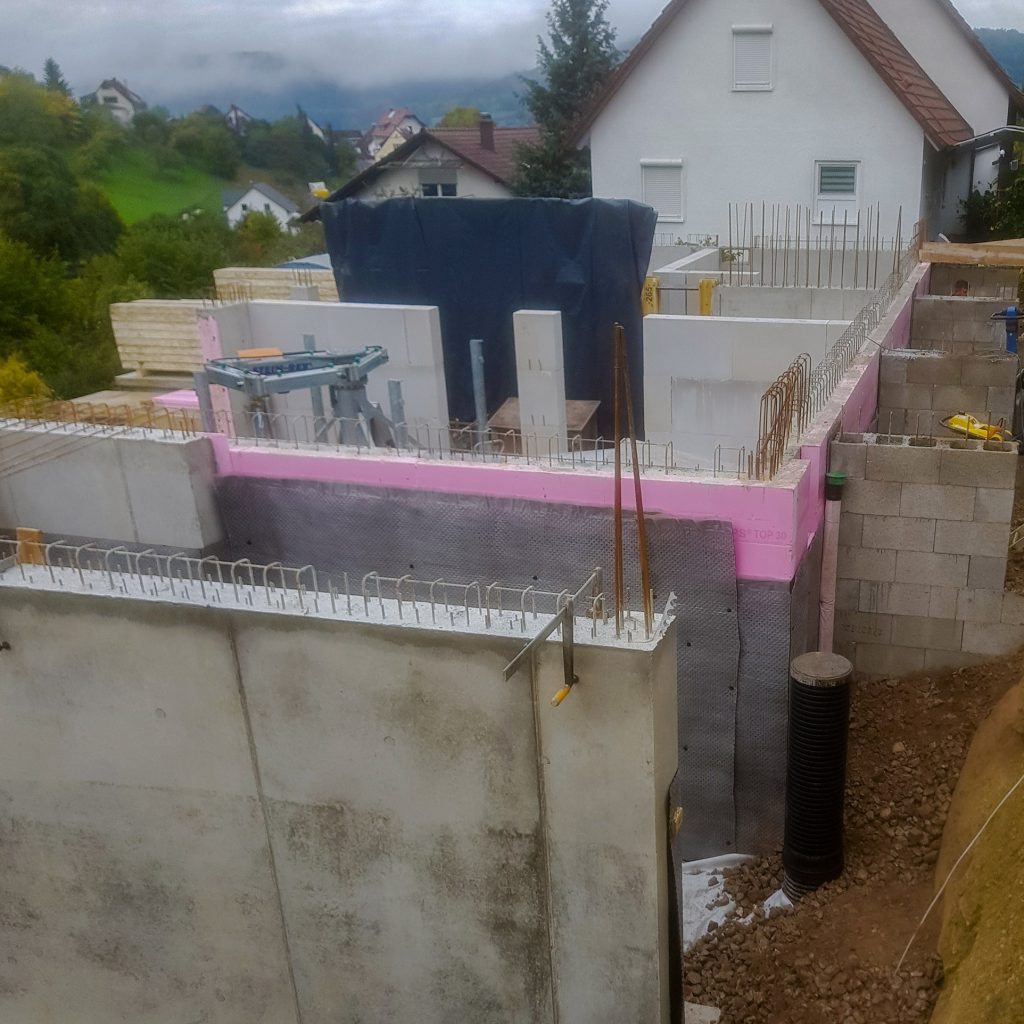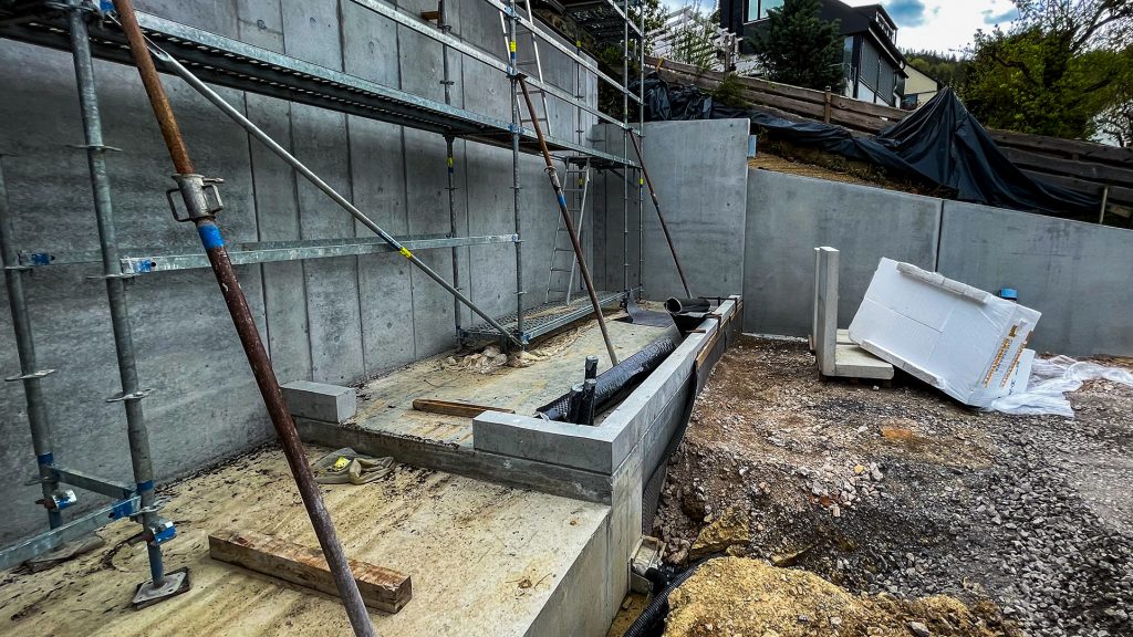 Neubau Wohnhaus in gehobenem Standard mit Außenanlage, Raumhohe Sichtbetonwand, Sichtbetontreppe, Sichtbetonterrasse, Dränbeton als Geh- und Verkehrsfläche im Außenbereich, Erdarbeiten, Entwässerung, Gebäudeversorgung ab Straße, Carport und Geländemodellierung.