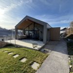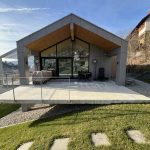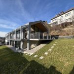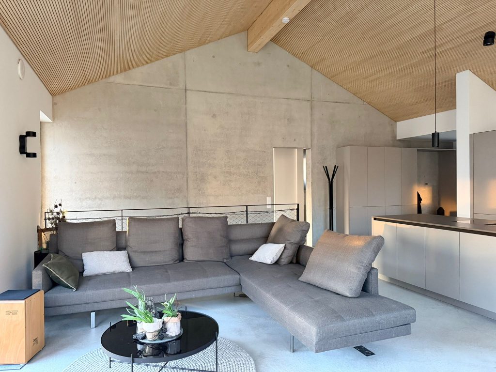 Exklusiver Wohnhausneubau mit raumhohen Sichtbetonbauteilen, Dränbeton-Außenflächen, kompletter Gebäudeerschließung und modellierter Außenanlage.