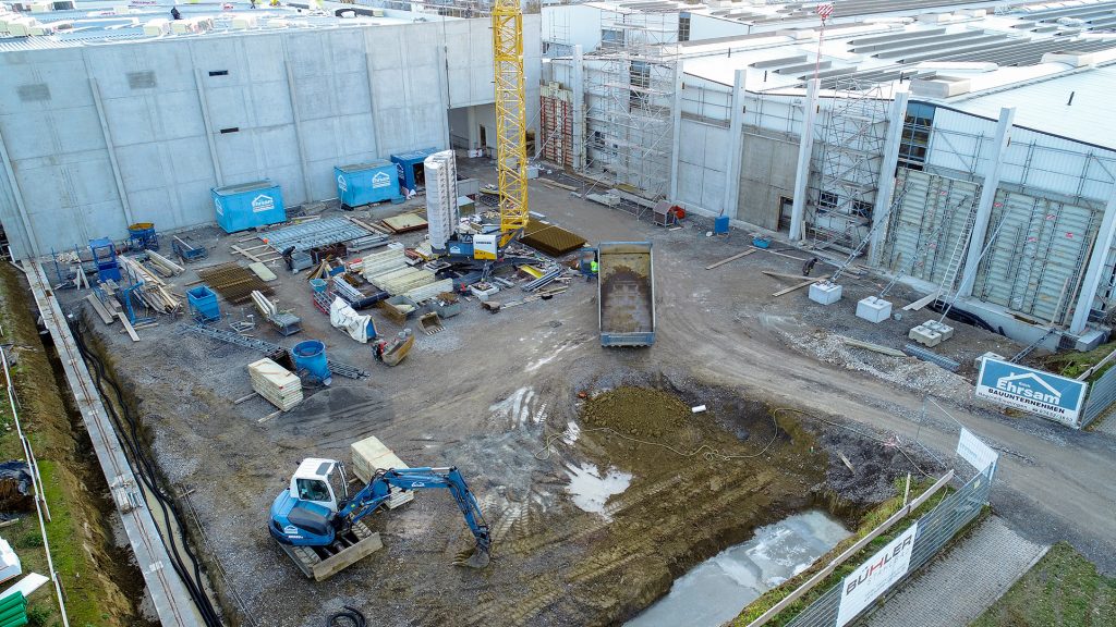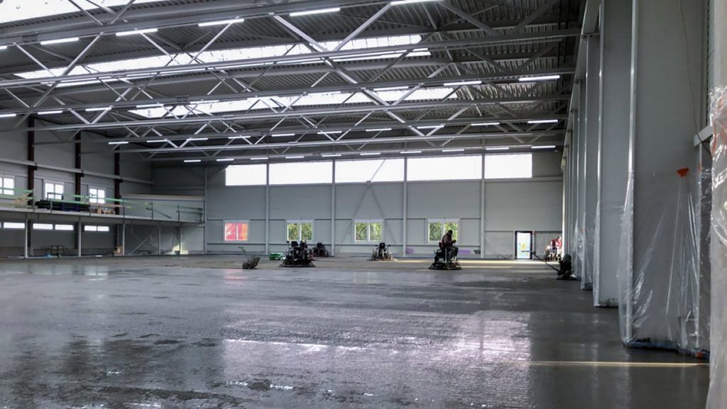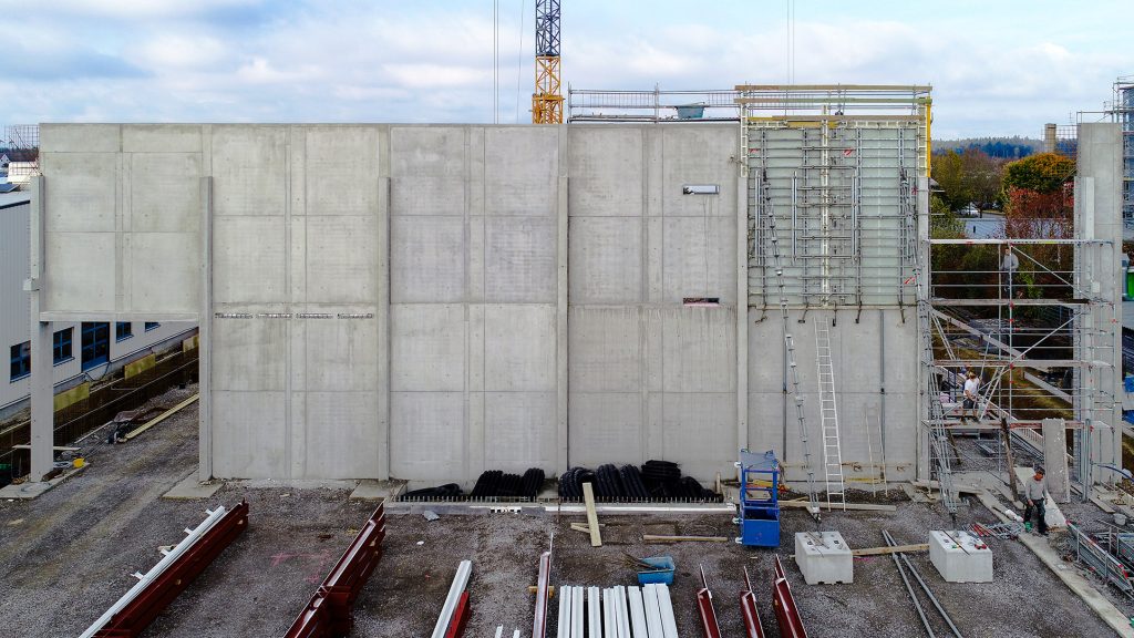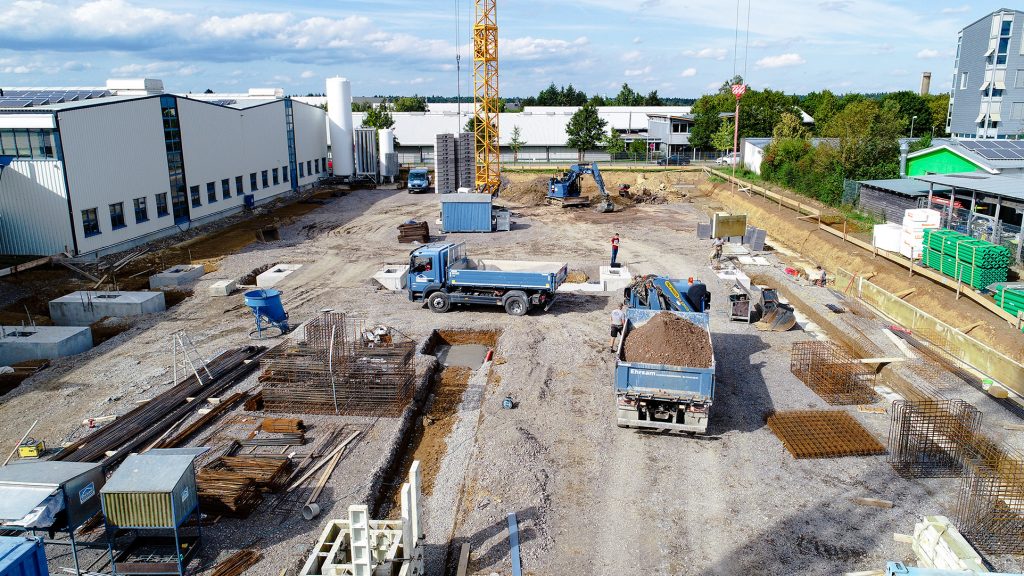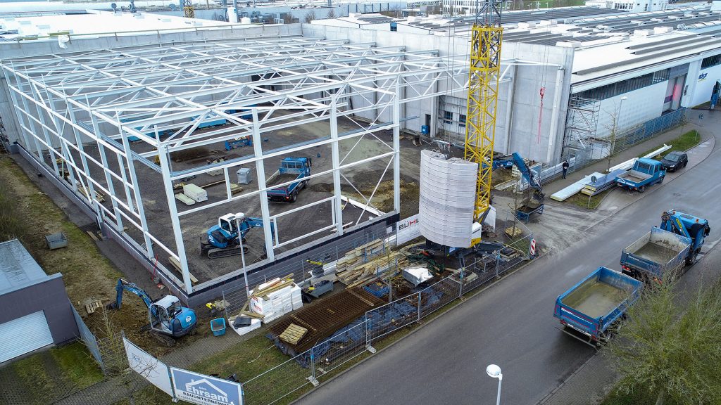 Neubau in zwei Bauabschnitten mit Stahlbeton- und Stahlbau, Industriebetonboden mit hohen Toleranzen sowie umfassenden Erd- und Außenanlagenarbeiten.