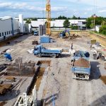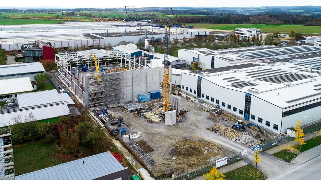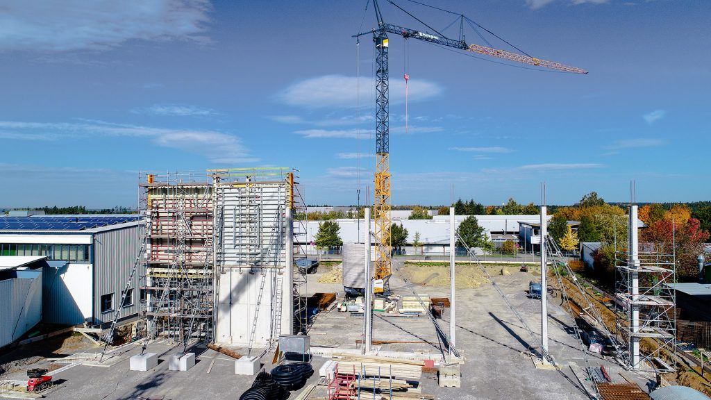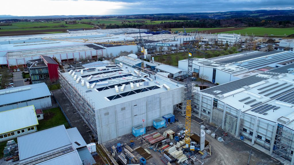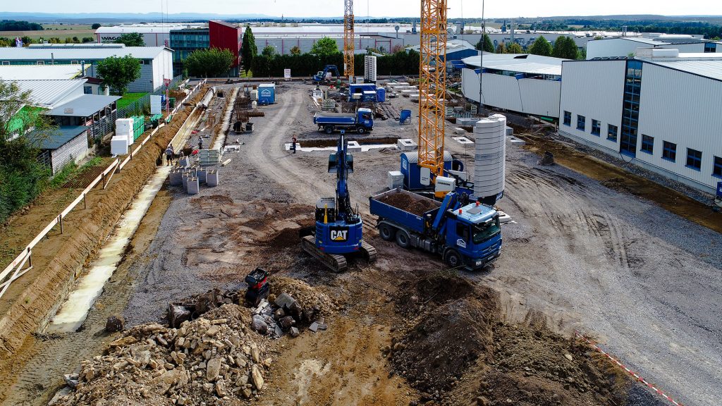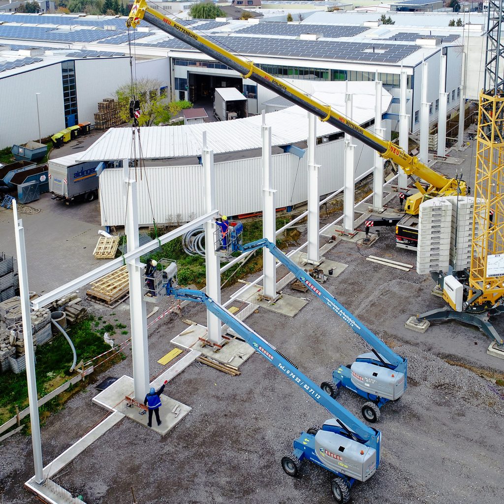 Neubau in zwei Bauabschnitten mit Stahlbeton- und Stahlbau, Industriebetonboden mit hohen Toleranzen sowie umfassenden Erd- und Außenanlagenarbeiten.