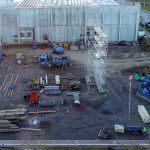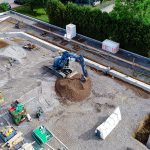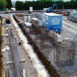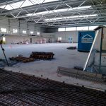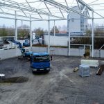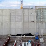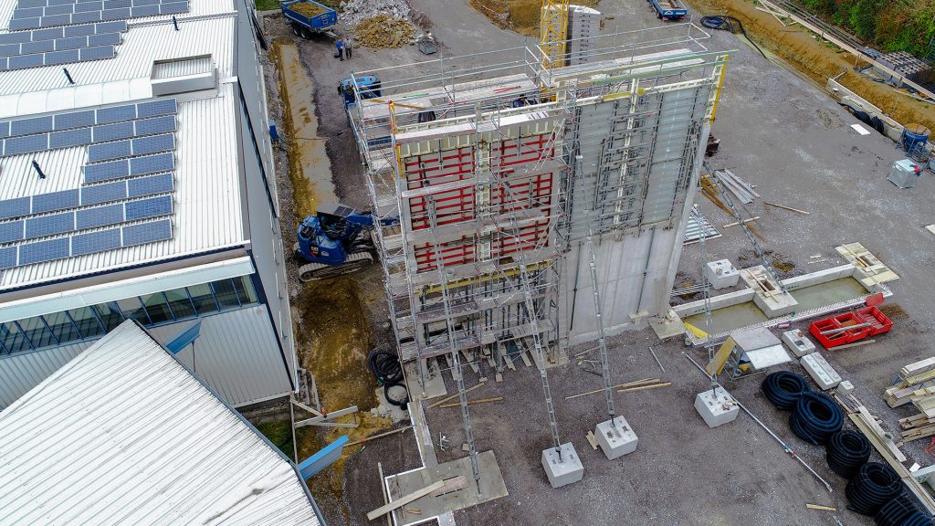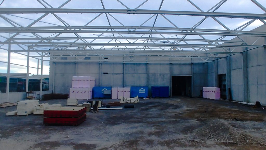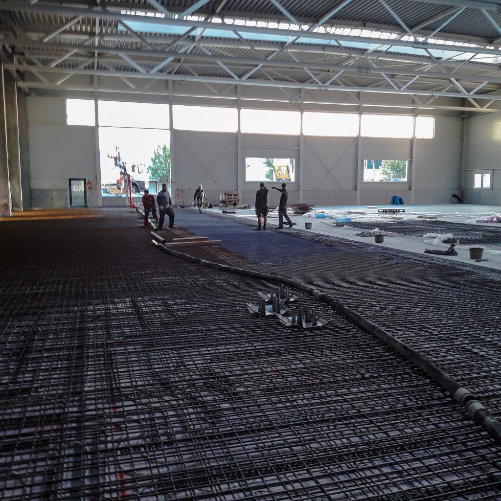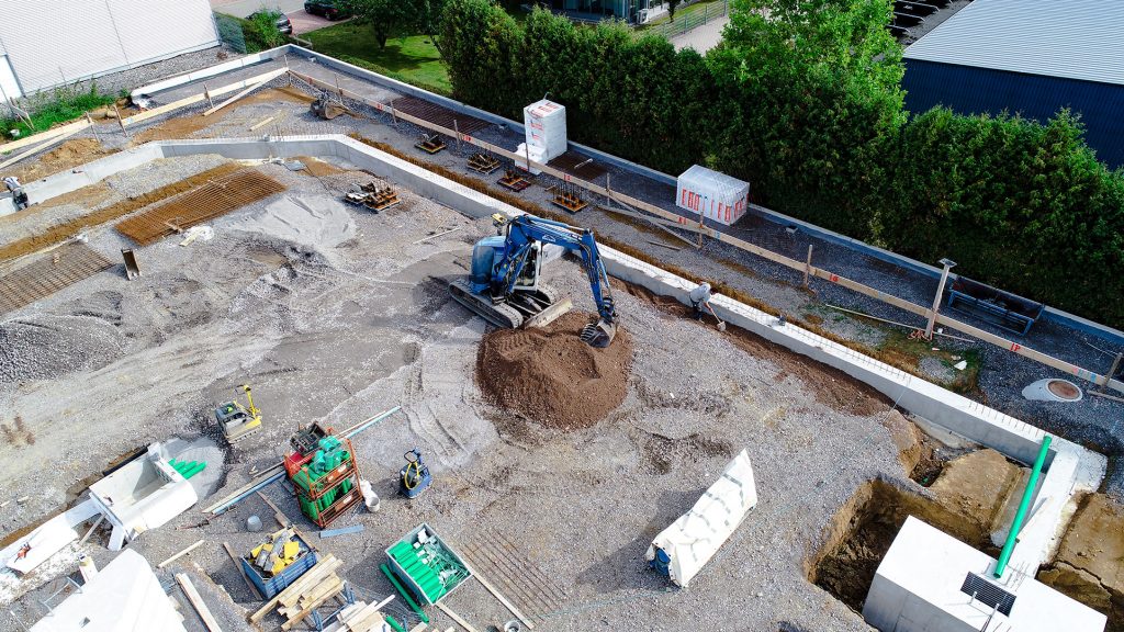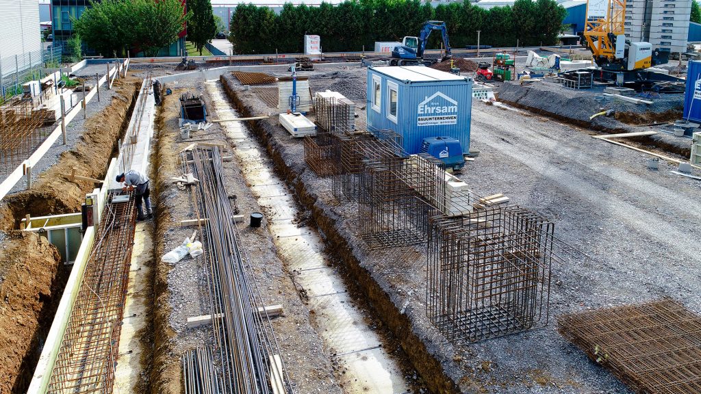 Neubau in zwei Abschnitten, Stahlbetonarbeiten, nachträgliche Bodenplatte und Decke im Stahlbau, geglätteter Industriebetonboden mit erhöhten Toleranzanforderungen, Brandwand, Erdarbeiten, Entwässerungsarbeiten, Dämmung und Abdichtung, Außenanlagen.