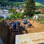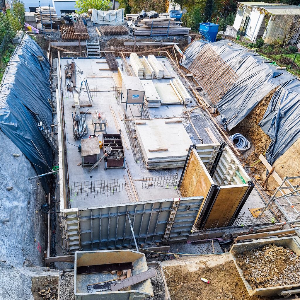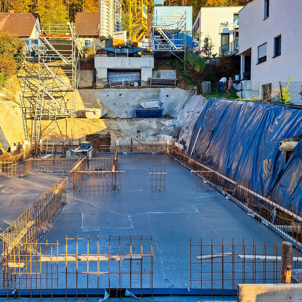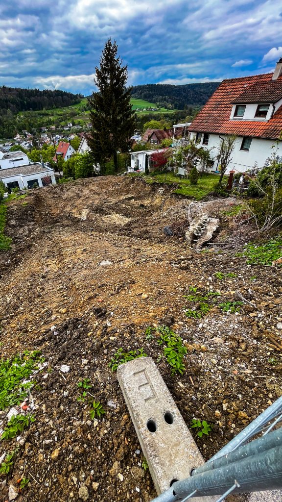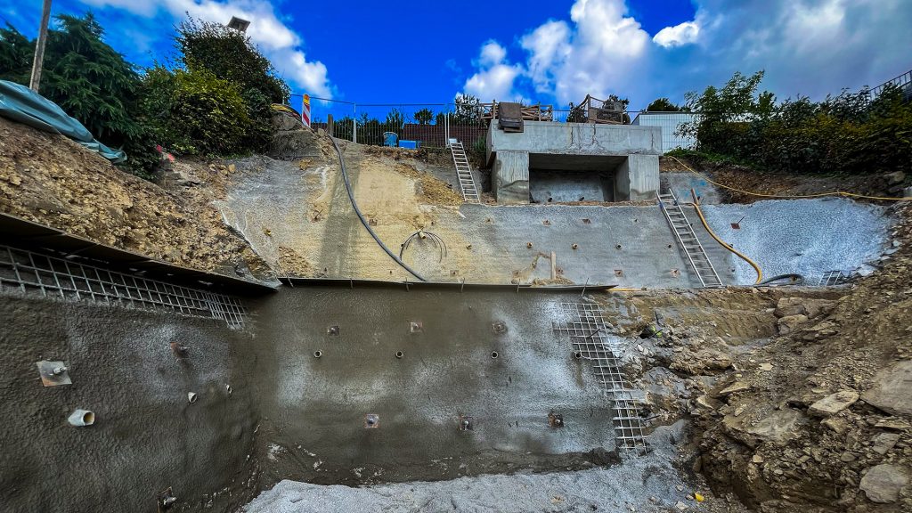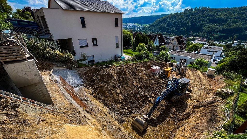 Neubau in steiler Hanglage mit komplexer Logistik, Spritzbetonverbau, Tiefgründung, umfangreichen Stahlbeton- und anspruchsvollen Außenanlagenarbeiten.