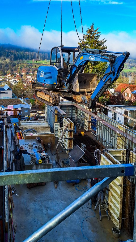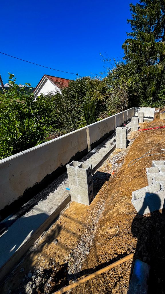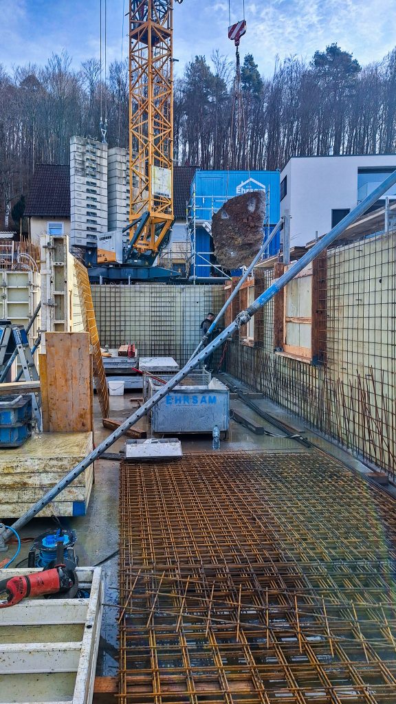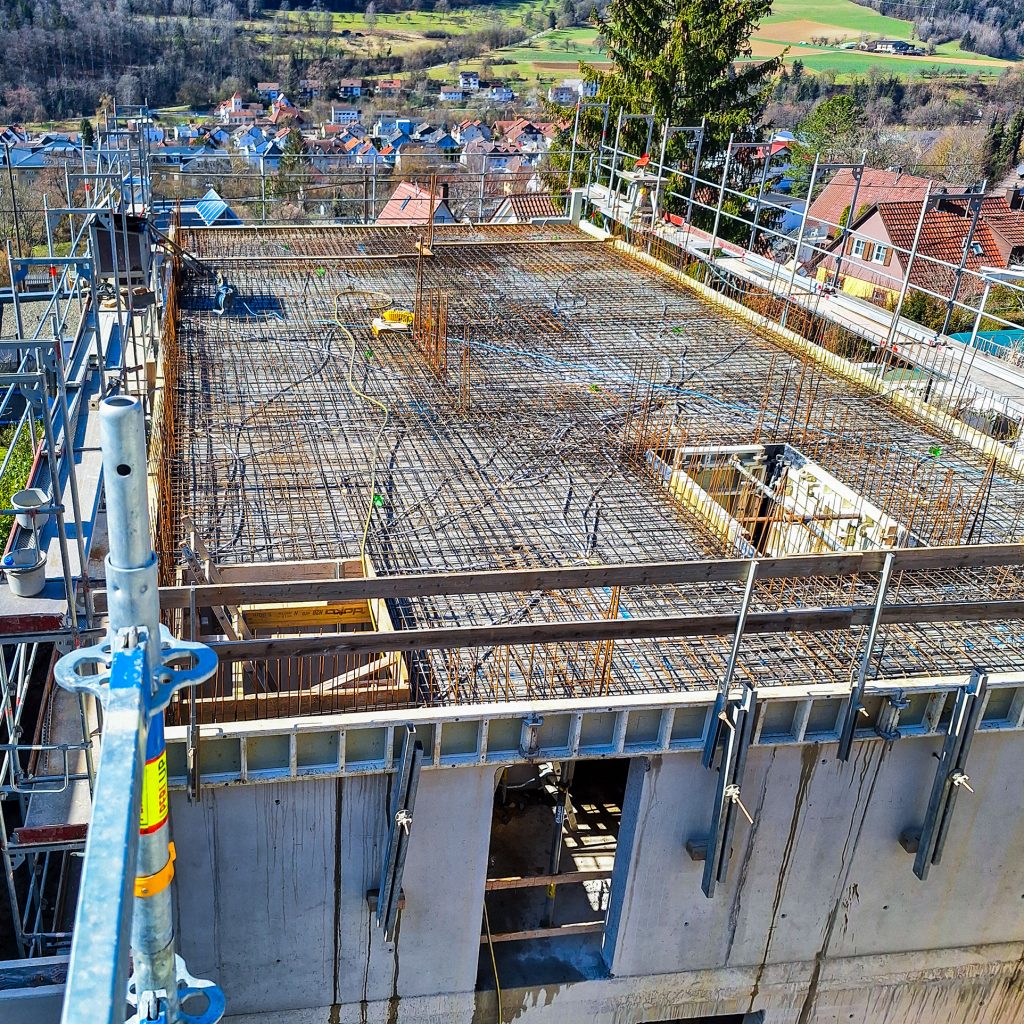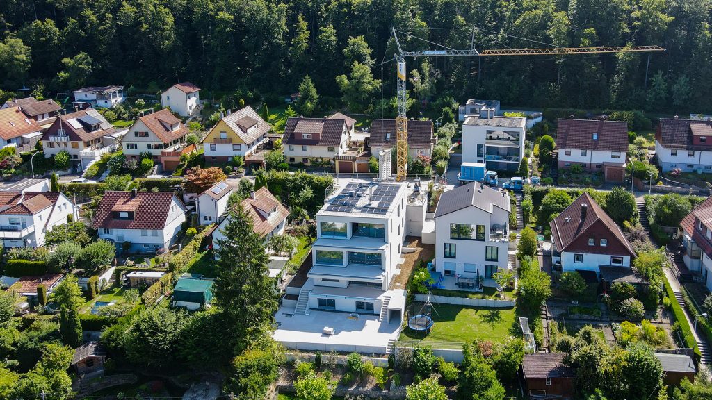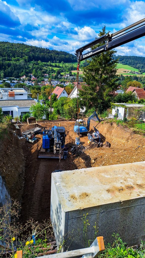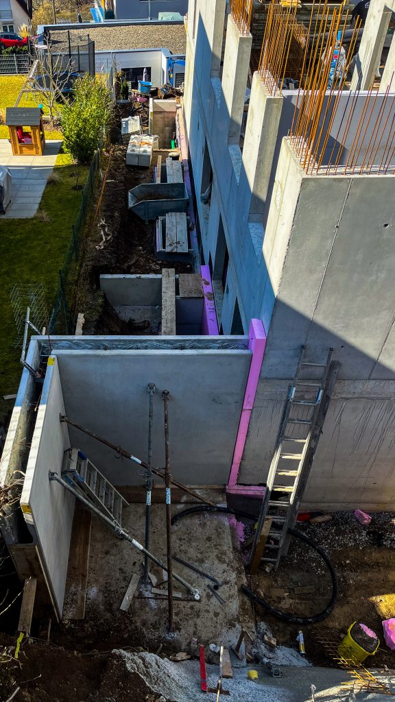 Neubau in steiler Hanglage mit komplexer Logistik, Spritzbetonverbau, Tiefgründung, umfangreichen Stahlbeton- und anspruchsvollen Außenanlagenarbeiten.
