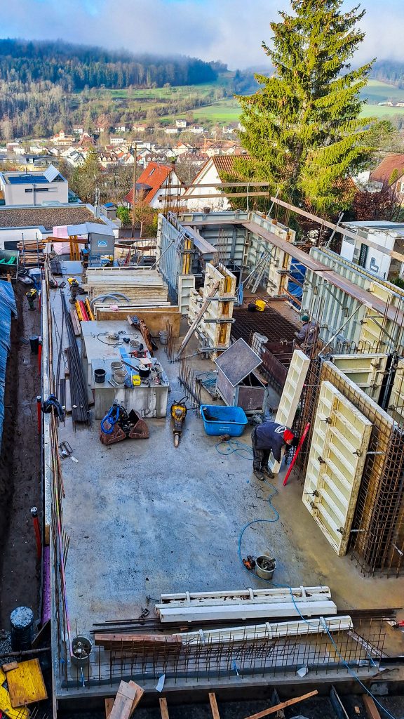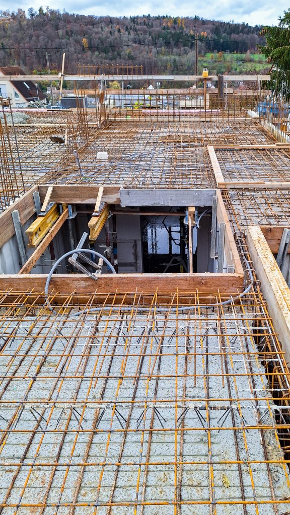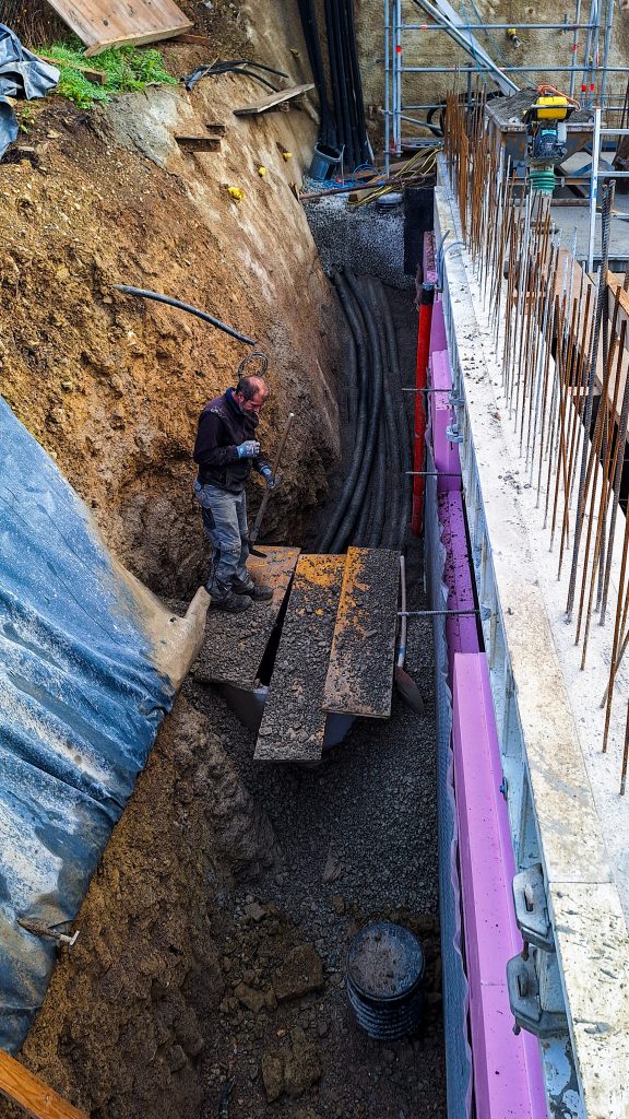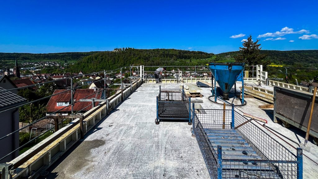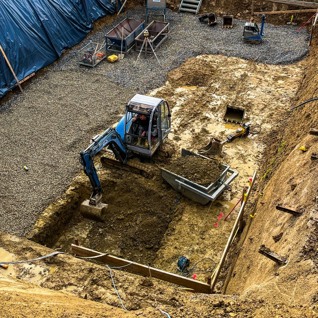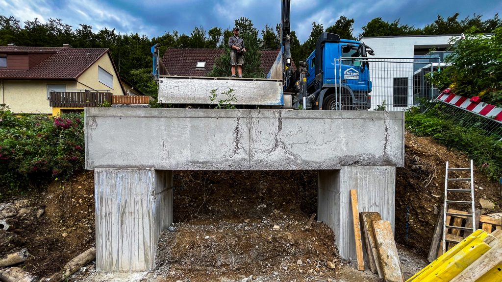 Neubau in steiler Hanglage mit komplexer Logistik, Spritzbetonverbau, Tiefgründung, umfangreichen Stahlbeton- und anspruchsvollen Außenanlagenarbeiten.