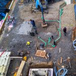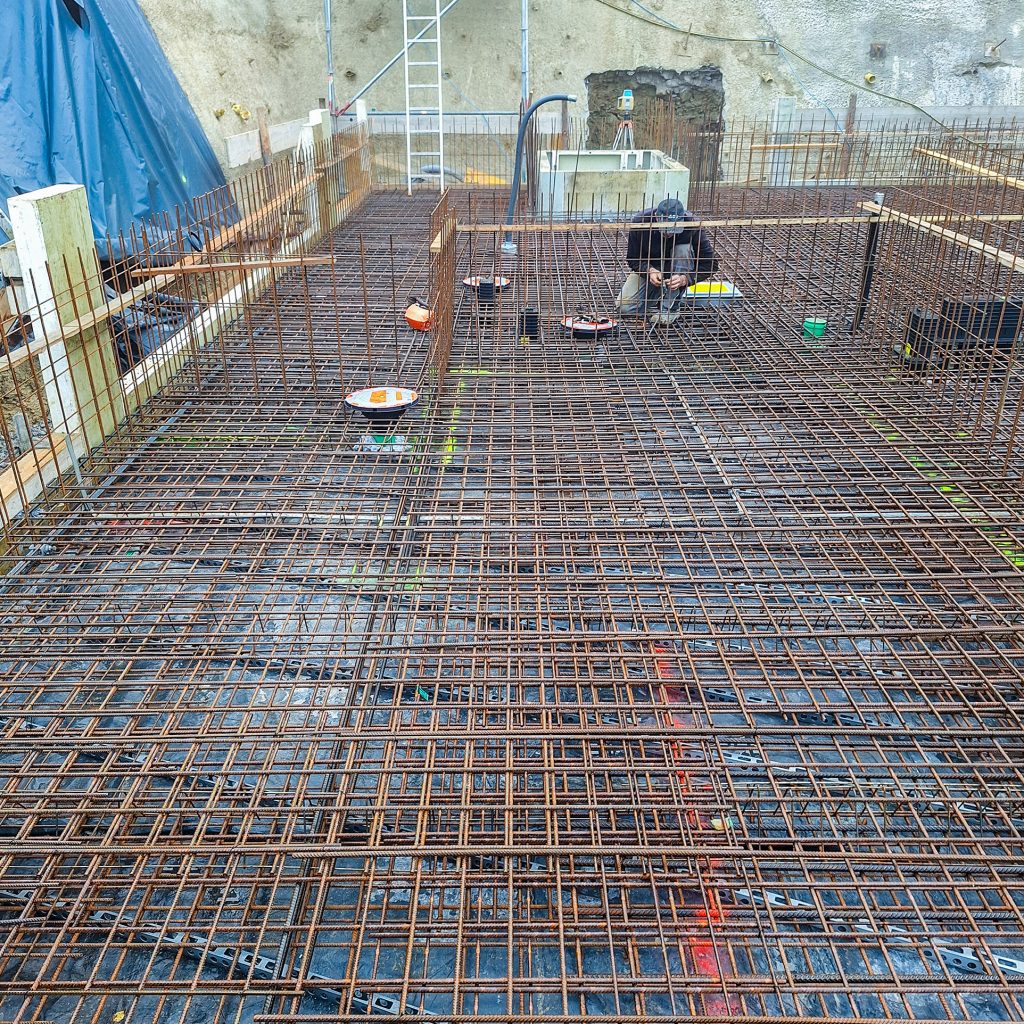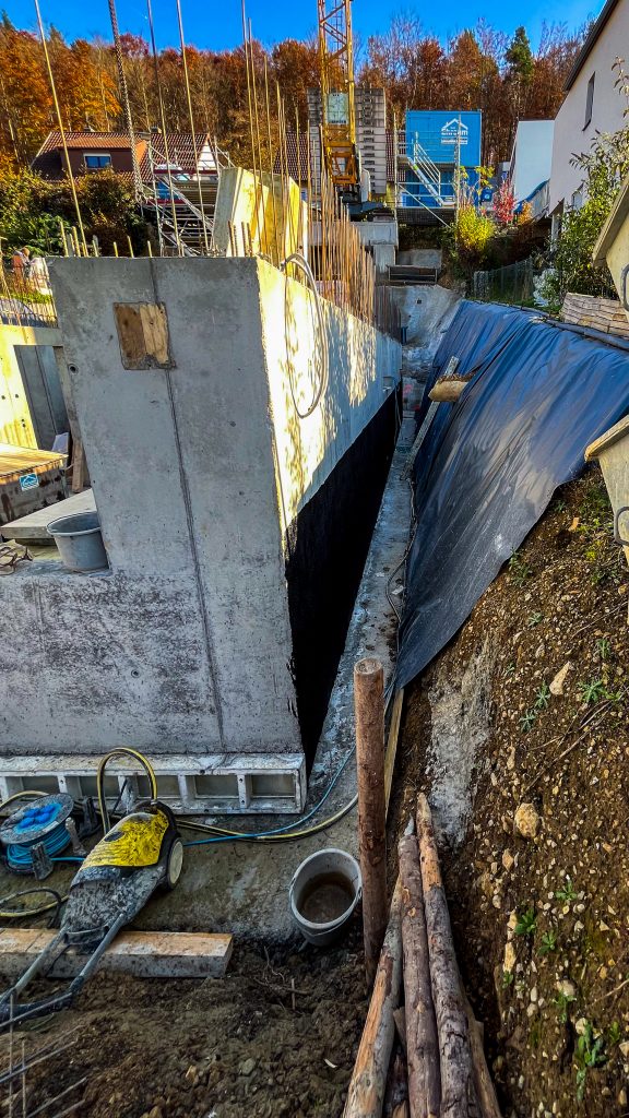 Neubau Mehrfamilienhaus in starker Hanglage und schwierigem Zugang, kaum Lagerfläche und komplexe Logistik, Straßensperrung, flexible Anpassung an jeden Bauherrenwunsch auch während der Ausführung, Baugrube mit Spritzbetonverbau, Kranfundament mit Tiefengründung, Entwässerungsarbeiten, Stahlbetonarbeiten, Sichtbetongartenhaus, Betonstützwände, Mauerwerksarbeiten, Dämmung, Abdichtung, Auffüllung über drei Geschosse, Außenanlage, Pflaster und Terrassenflächen.