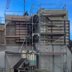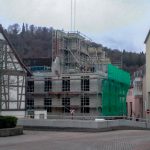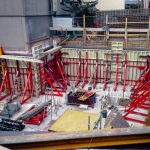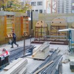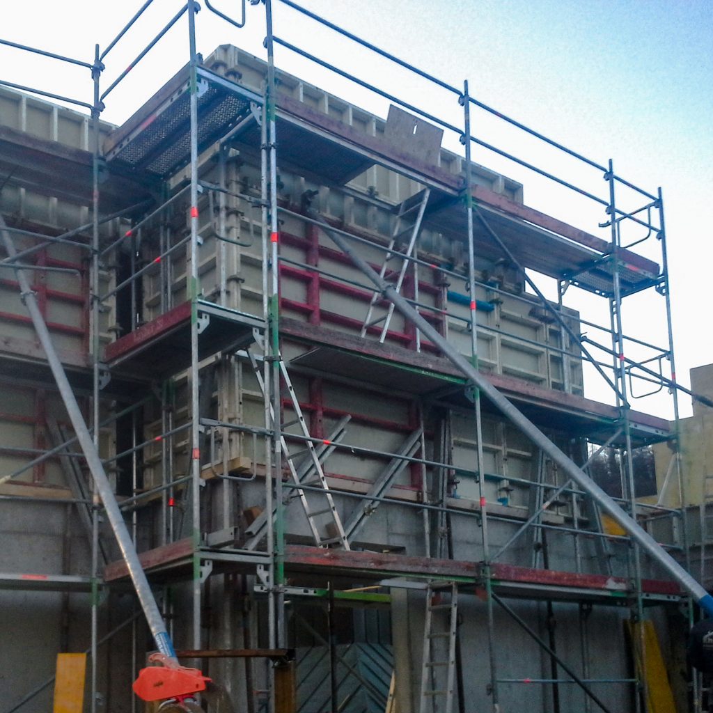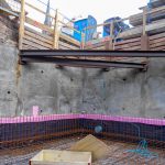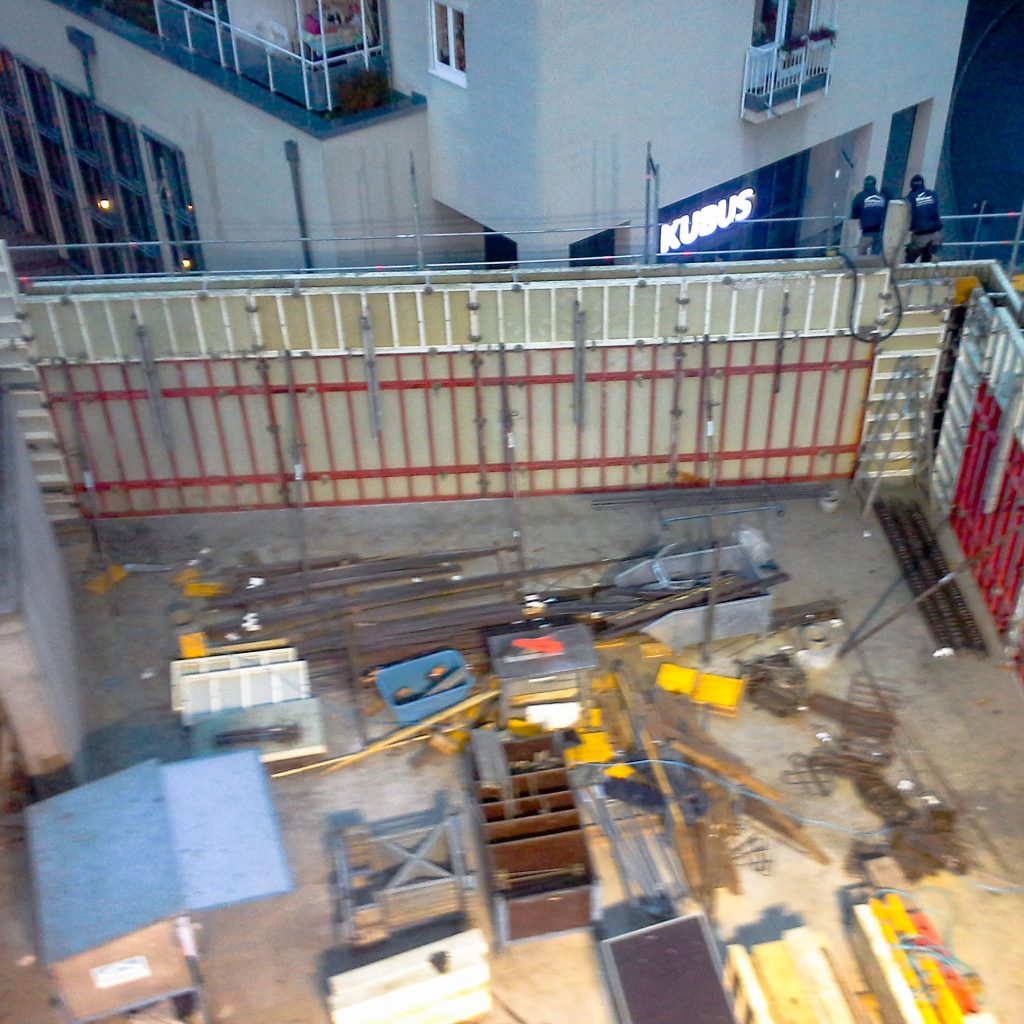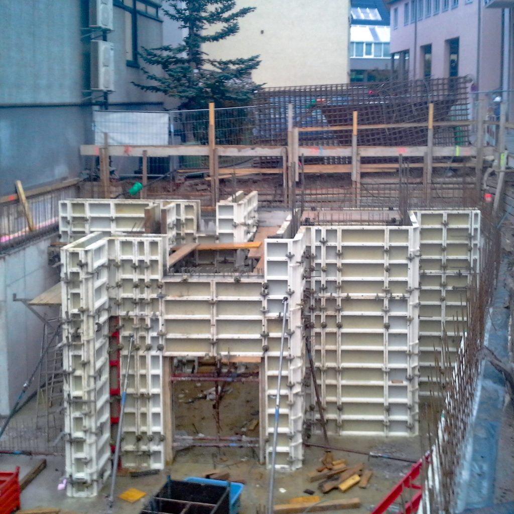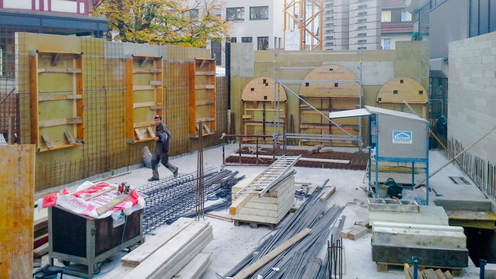 Neubau in der Innenstadt, Baugrube, Verbau und Abstützung, Erhalt Nachbarbestand, Stahlbetonarbeiten, Untergeschoss als weiße Wanne im Grundwasser, Rundbögen, Dämmung und Abdichtung