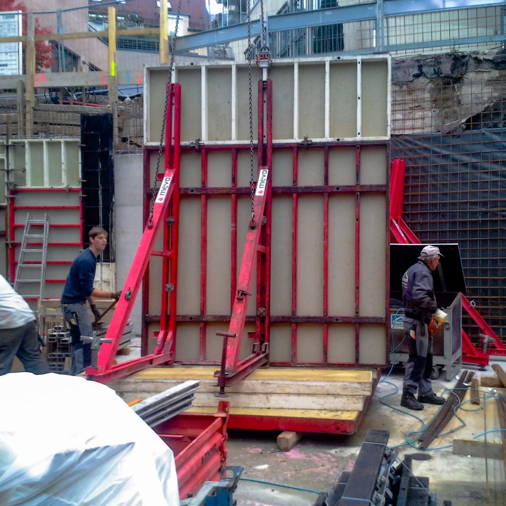 Innerstädtischer Neubau mit anspruchsvoller Baugrube, Untergeschoss als weiße Wanne im Grundwasser sowie komplexen Stahlbeton- und Abdichtungsarbeiten.